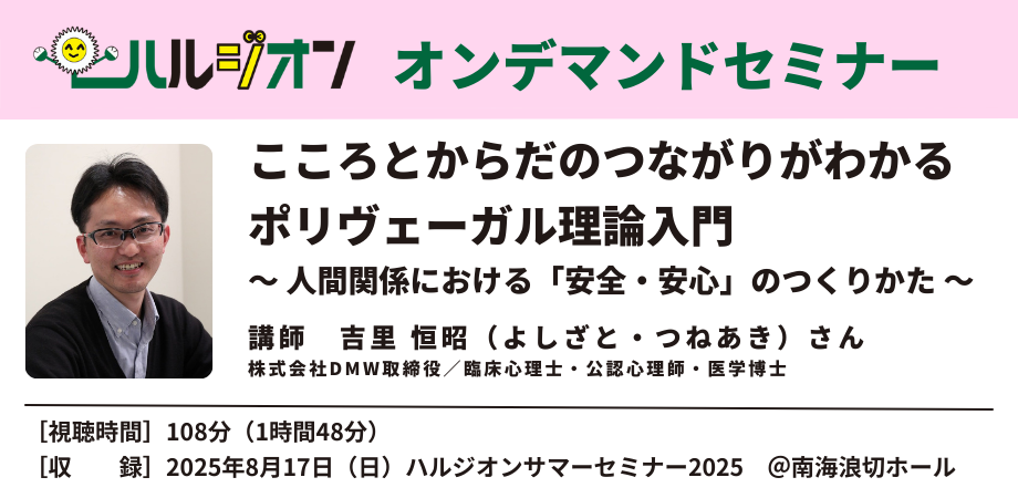 真夏のおとなの学び場「ハルジオンサマーセミナー2025」(2025年8月17日開催)で大好評をいただいた、吉里恒昭さんによる「ポリヴェーガル理論」の入門講義を、期間限定オンデマンド配信(Vimeo)で皆様にお届けします。